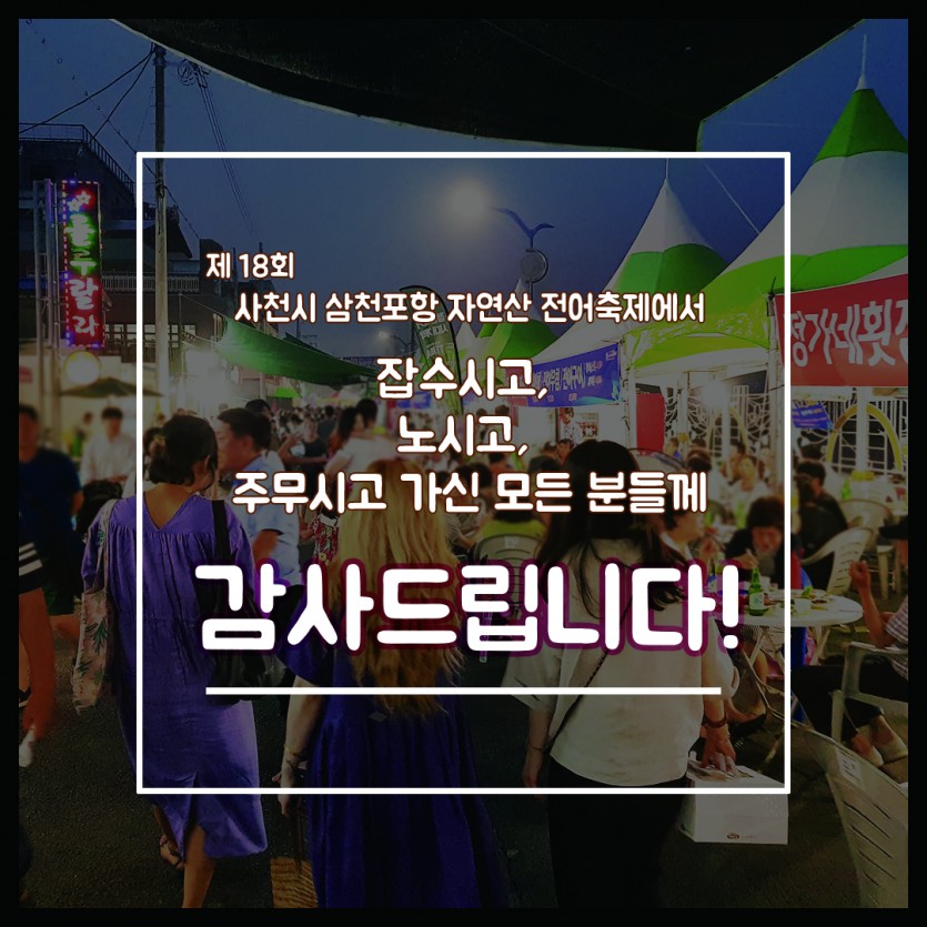 제18회 사천시 삼천포항 자연산 전어축제 행사 종료 안내 페이지 정보 작성자 관… 작성일19-07-30 17:46 조회7,180회 관련링크 이전글 다음글 목록 본문 제18회 사천시 삼천포항 자연산 전어축제에 많은 관심과 방문 감사드립니다. 내년에는 더욱 발전된 모습으로 준비하여 찾아오겠습니다. 이전글 다음글 목록