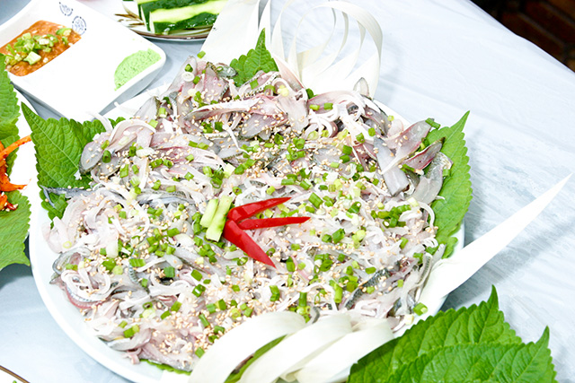 전어회가 무와 당근, 양파, 오이 등과 함께 무침의 빨간색이 보는 것만으로도 입맛을 자극합니다. 회와 같은 맛에 시큼한 장맛과 신선한 야채맛이 어우러져 새콤하면서도 시원한 맛이 입안을 감쌉니다.